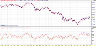 El Ibex no es una excepción en la pinta bajista. Tras el fallo alcista, tenemos una vela semanal bajista denominada estrella fugaz. Además los indicadores stochasticos diarios y semanales están claramente sobrecomprados (necesitan una corrección) y el indicador RSI muestra una divergencia clarísima. Coincidiendo con los sucesivos máximos, el indicador no ha podido superar los sucesivos picos, como vemos en el gráfico.