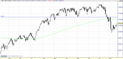 En cuanto al Ibex, seguimos en un momento de recuperación, pero aún hay un gran riesgo de perder los mínimos anuales. Lo que ocurre es que si los americanos siguen subiendo, vamos a ver niveles más elevados de Ibex.