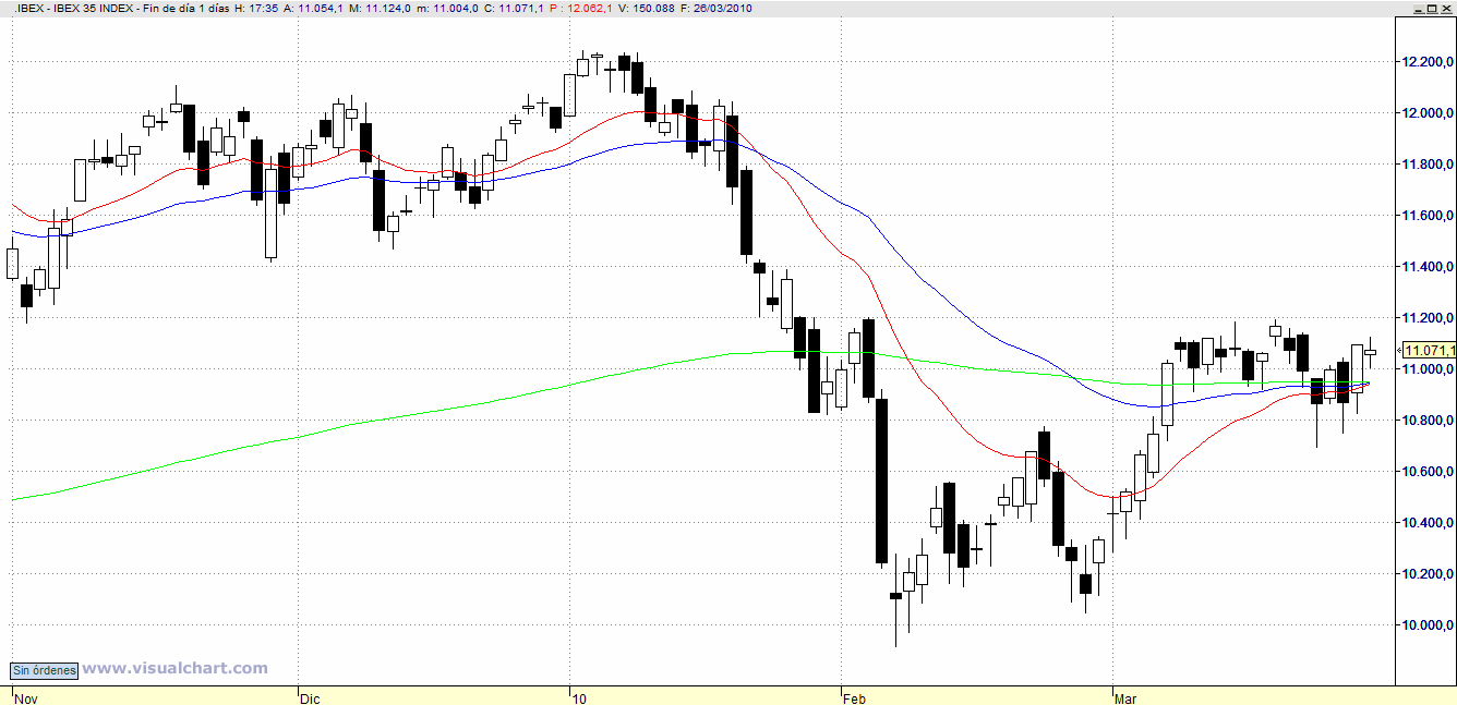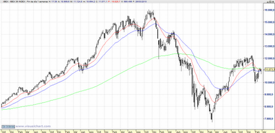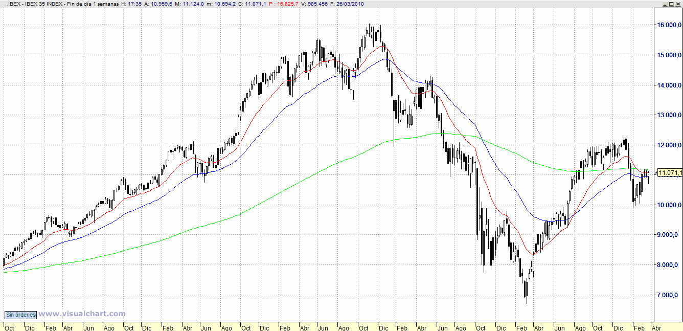 Estudiando el gráfico del Ibex diario vemos una señal muy interesante. y es la proximidad de las medias con el precio. Da la impresión de que estamos ante un inminente «triple cruce de medias». Esta señal es muy importante porque augura un gran movimiento alcista.