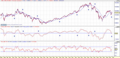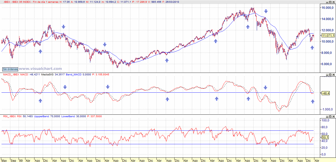Si además de esto miramos el MACD semanal, observaremos que si subimos un poco más, se cumplirá el apoyo del MACD en la línea de cero, una de las señales que vuelve a augurar un gran movimiento alcista.En el gráfico vemos como cada vez que el indicador se ha girado sobre la linea de cero ha venido un gran movimiento.