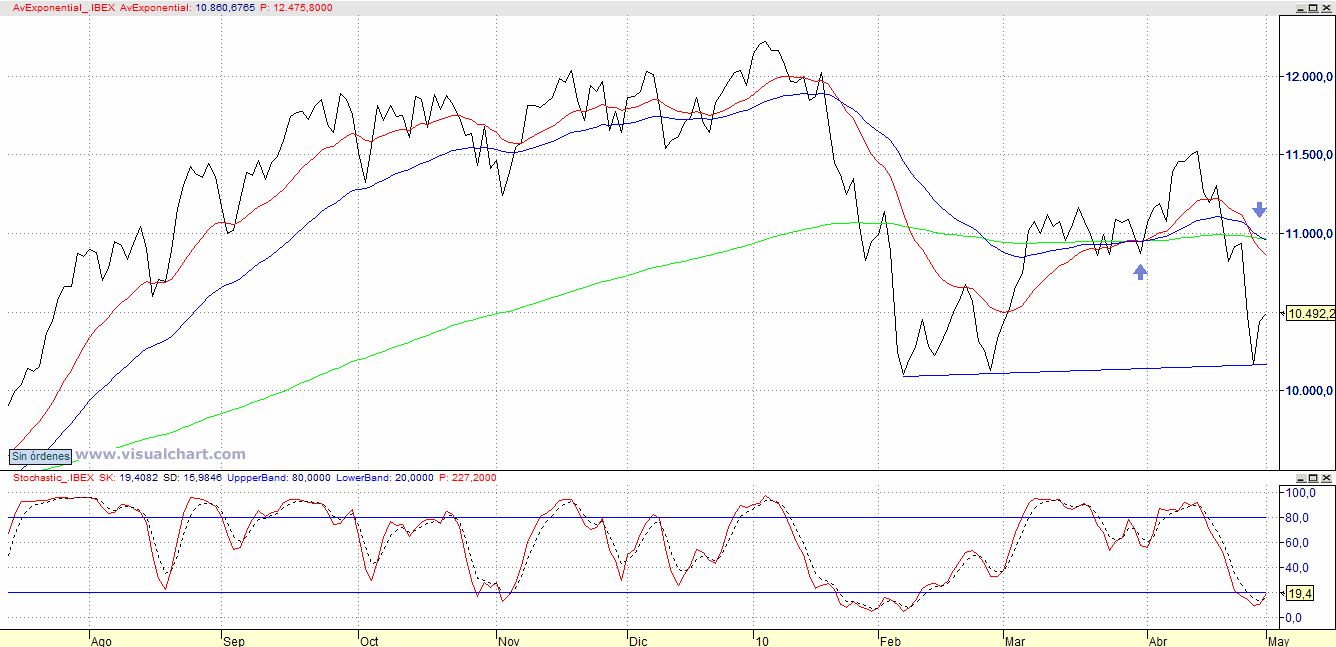 En las dos flechitas que aparecen en el gráfico, se observa que hubo un triple cruce alcista hace un par de semanas, pero que ha sido un fallo y ahora se ha producido el triple cruce bajista, que es una señal muy contundente. Es cierto que si falló al alza, ahora puede hacerlo a la baja, pero las precauciones tienen que ser máximas.