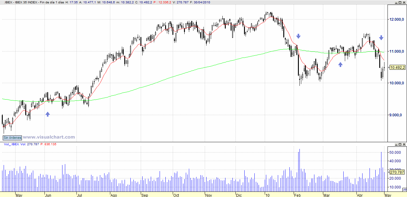 La señal bajista, anterior al gráfico que vemos, nos llevó desde los 14.600 que dio la señal el 10-1-2008 hasta los mínimos de 6.700 y no volvió a dar señal alcista hasta el 02-06-2010, un año y cinco meses después en los 9.665. Esta señal es la primera flecha que se ve en el gráfico. Como vemos nos llevó a hacer un máximo en los 12.240, y no ha sido hasta ocho meses después, que ha dado señal bajista. Aquí es donde se han producido tres señales falsas, porque con poco más de un mes se han anulado, cruzandose en sentido contrario ( hay que tener en cuenta que hablamos de un sistema de largo plazo).