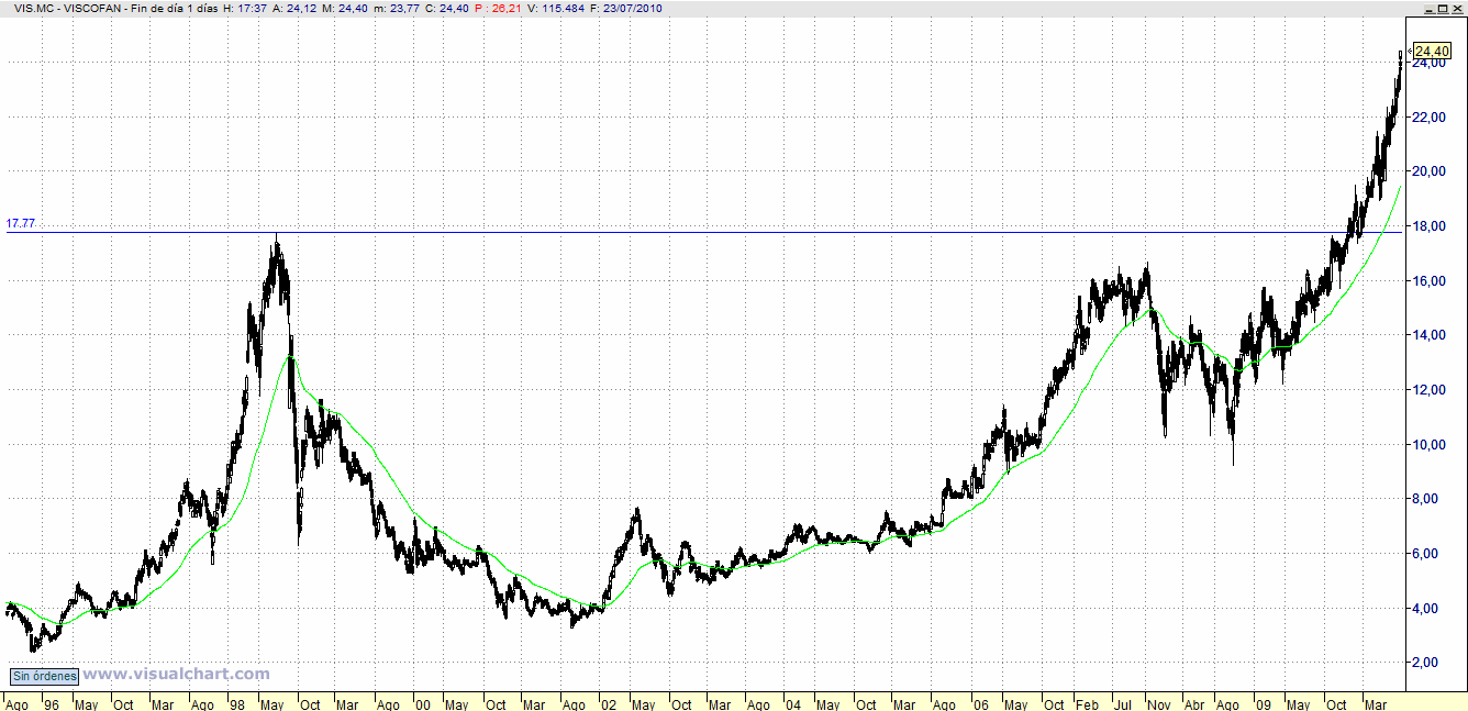 Vamos a poner el gráfico de Viscofán, que lleva ya un tiempo en máximo histórico, para ver que es lo que debería de hacer Inditex (segundo gráfico) tras la superación de esta semana.