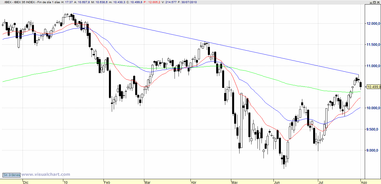 Finalmente, si somos consecuentes con el análisis técnico, no deberíamos de comprar ni tener bolsa en cartera a menos que superemos los 10.800.