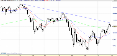 Esta señal es doblemente importante. Por un lado nos confirma que el mercado es bajista y que no ha podido superar la tendencia bajista, y por otro nos daría las claves para que cambiara el escenario a alcista. Esta situación vendría si el Ibex fuera capaz de superar los máximos del Jueves en la zona de los 10.800.