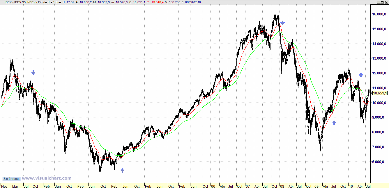 Hoy vamos a estudiar un cruce de medias que da señales de largo plazo. El cruce que vamos a estudiar es el de la media de 70 periodos con la de 200. Es una señal que suele dar largos periodos de tendencia alcista o bajista. Si miramos el gráfico de largo plazo, vemos que en diez años, solamente ha habido cambio de tendencia en cinco ocasiones. Lo vemos con las flechas.