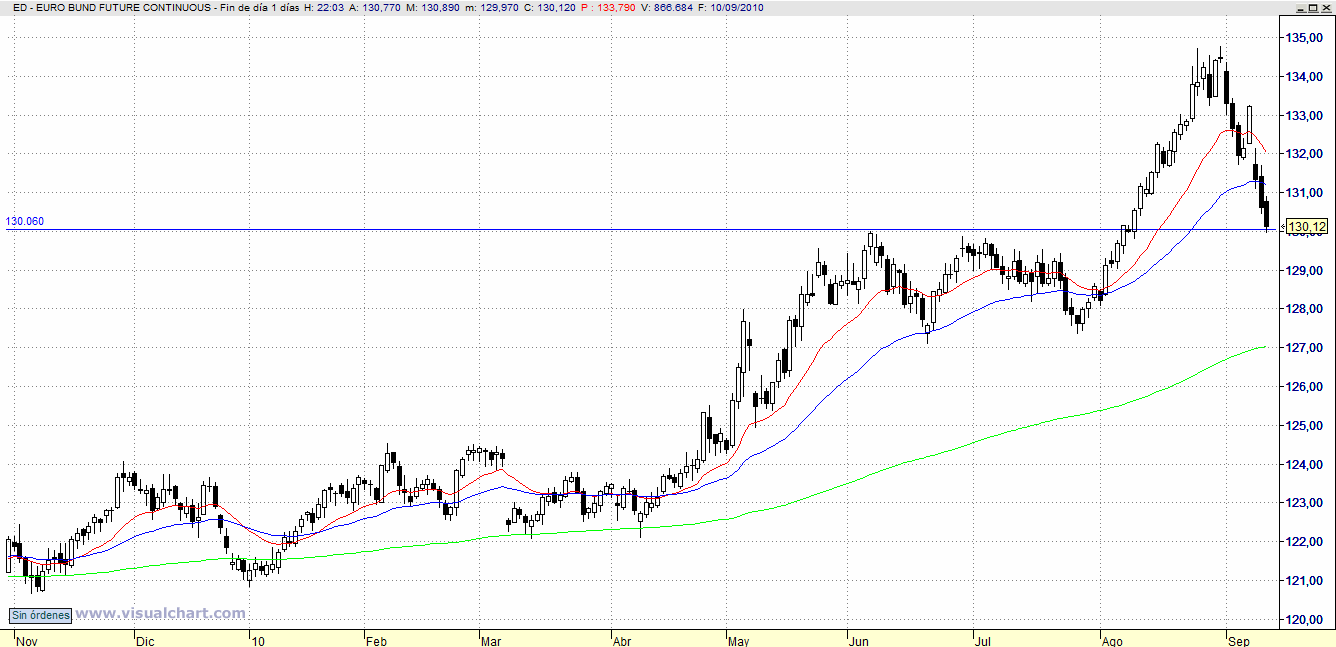 Lo interesante, es que el Bund ha sufrido una buena corrección en dos semanas y se ha apoyado en el nivel de 130, que es un soporte importantísimo. Lo lógico sería que desde aquí el Bund rebotara, aunque no sabemos si para ir a buscar nuevos máximos. Lo importante es que es muy probable que suba, por lo que trasladado a los índices bursátiles, estos deberían bajar.