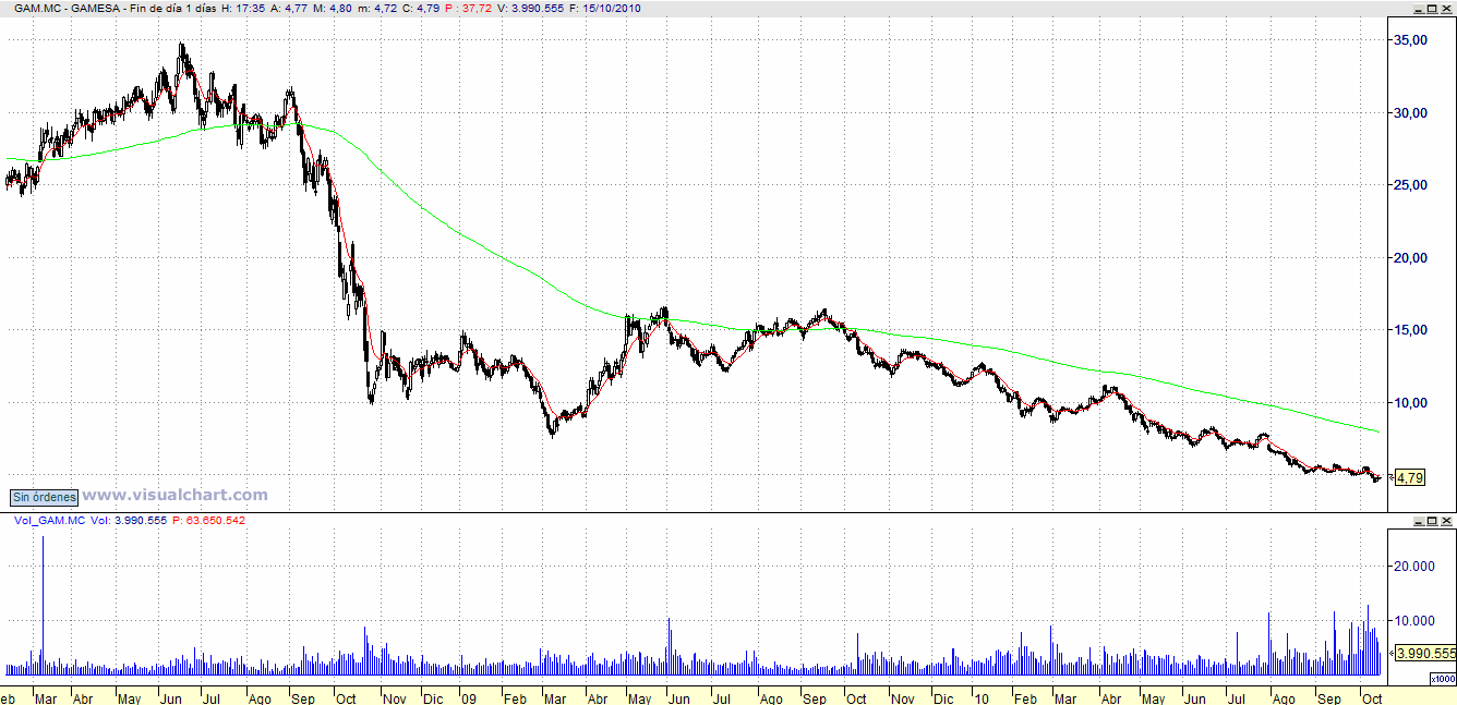 Gamesa, sin embargo, no ha dado ninguna señal de vuelta, continúa claramente bajista, aunque no está de mas seguirla de cerca y entrar si supera los 5 Euros. Evidentemente, siempre con Stop.