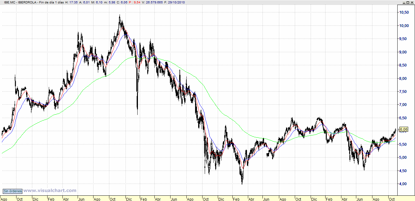 Parece que ya ha acabado el calvario en Iberdrola y la media de 200 periodos ya muestra tendencia positiva. Puede ser una excelente inversión a Largo plazo, porque acaba de superar los 6, cuando sus máximos están casi en 10,5, es una de las grandes del Ibex y ofrece unos dividendos cercanos al 5% anuales.