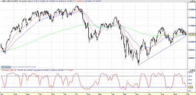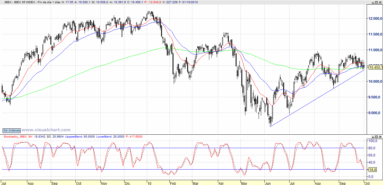 Con todo esto, y mirando el gráfico diario del Ibex, el aspecto parece más positivo que negativo. Esto es porque el indicador Stockastico diario está llegando a la zona baja y ultimamente está funcionando muy bien. Además, estamos muy cerca de apoyarnos en la linea de tendencia alcista secundaria dibujada en el gráfico.