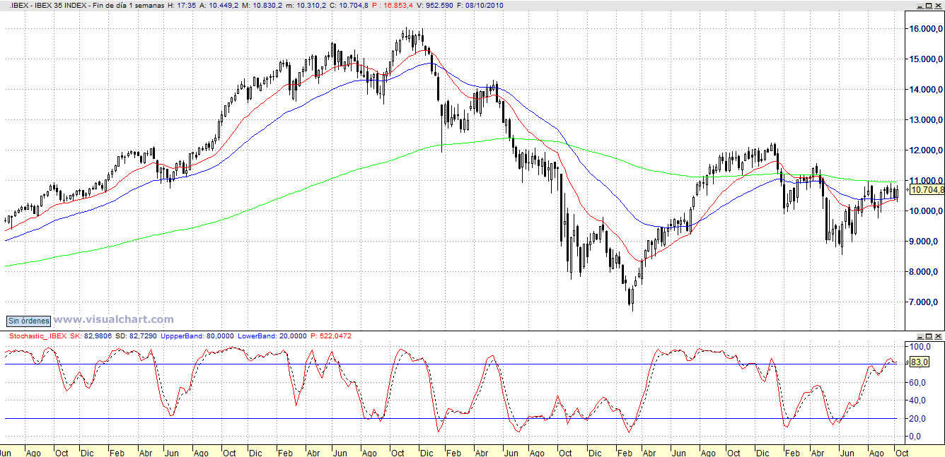 En el gráfico semanal se ve como tras el último impulso, el Ibex se resiste a subir más y el Stockastico está en zona de sobrecompra.