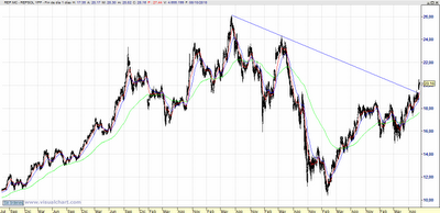 No va a ser fácil colocarse por encima de los 20,1 (máximo histórico una vez descontados los dividendos), por lo que no sería el momento de tomar posiciones hasta que lo veamos por encima de ese nivel.