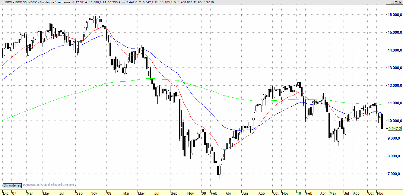Lo peor de todo es que vamos totalmente por libre. Esta vela semanal ha venido mientras los mercados que marcan las pautas mundiales siguen subiendo alegremente. Esto es muy grave, porque cuando estos mercados corrijan, no se que puede pasar con el Ibex.