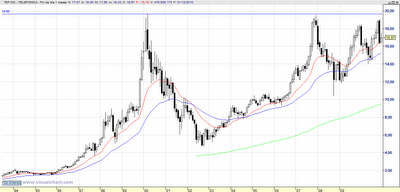 Inditex ha sido el protagonista de los grandes valores el año pasado. Cuando superó los 50 Euros y se colocó en subida libre, alcanzó los 65 y ahora está en proceso correctivo. Precios cercanos a los 50 Euros parecen una estupenda compra.
