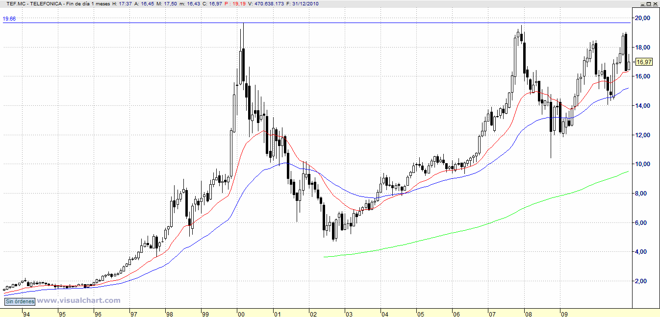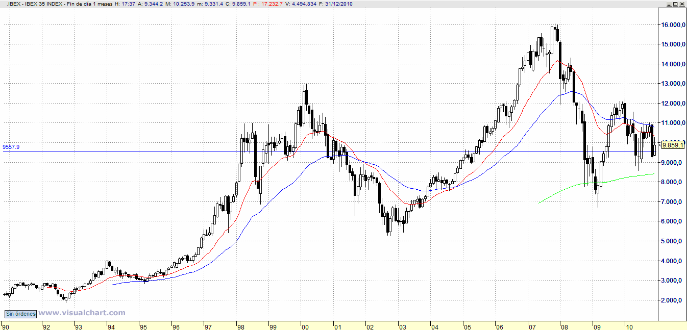 He puesto un gráfico con velas mensuales, en el que podemos ver un gráfico desde 1.990.