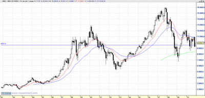 Hay una cosa clara, y es que hemos asistido a una sucesión de máximos decrecientes. 12.240-11.566 y 11.020. Y la teoría nos dice que en el momento en que se rompa esa sucesión pasaremos a ver un buen mercado alcista. Así pues el nivel más importante a vigilar es el 11.020.