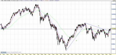Así pues, si no aparecen nuevos nubarrones en el horizonte el Ibex debería auparse hasta la zona de los 11.550 antes de recortar, para tomar un nuevo impulso.
