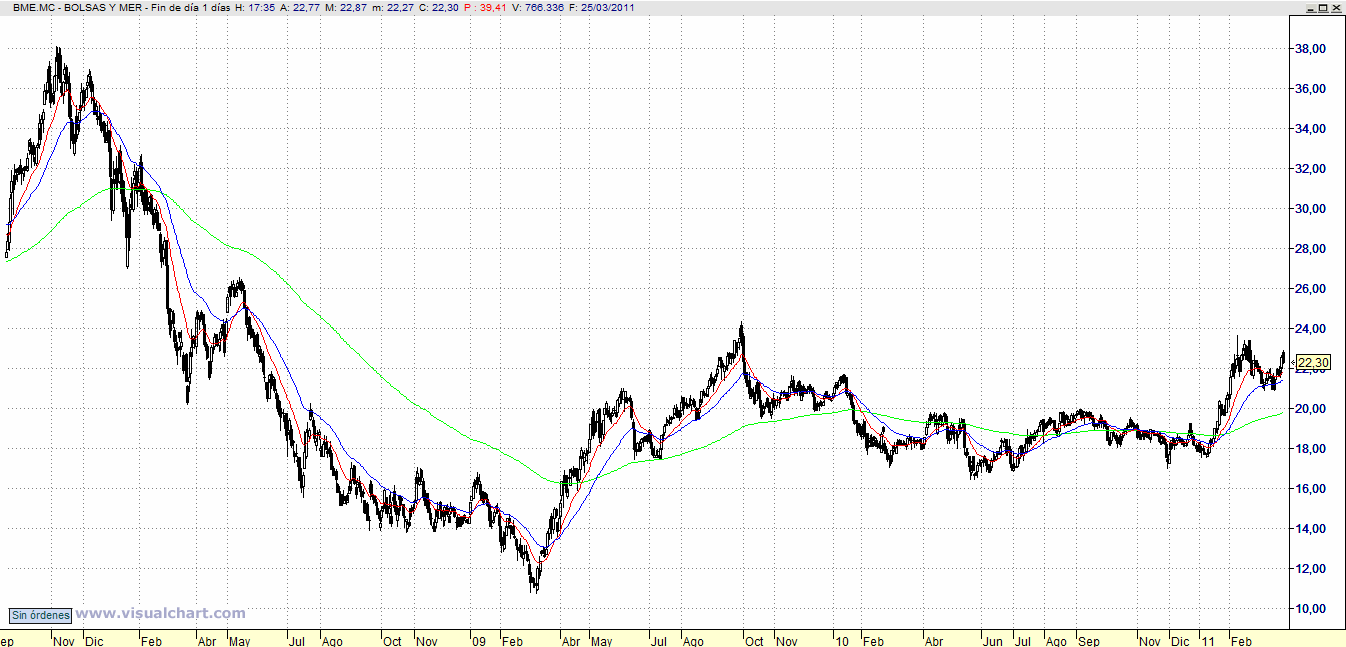 De las tres, técnicamente parece que la que está mejor es BME, ya que tuvo hace un mes un gran tirón que le ha situado como valor claramente alcista y actualmente está en plena digestión de la subida. Tras esta consolidación debería seguir subiendo.