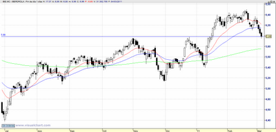 Inditex, parece que ha hecho un suelo y quiere volver a retomar su camino alcista. Ayer subió en contra del mercado, y si sube por encima de los 53, dará señal de compra.
