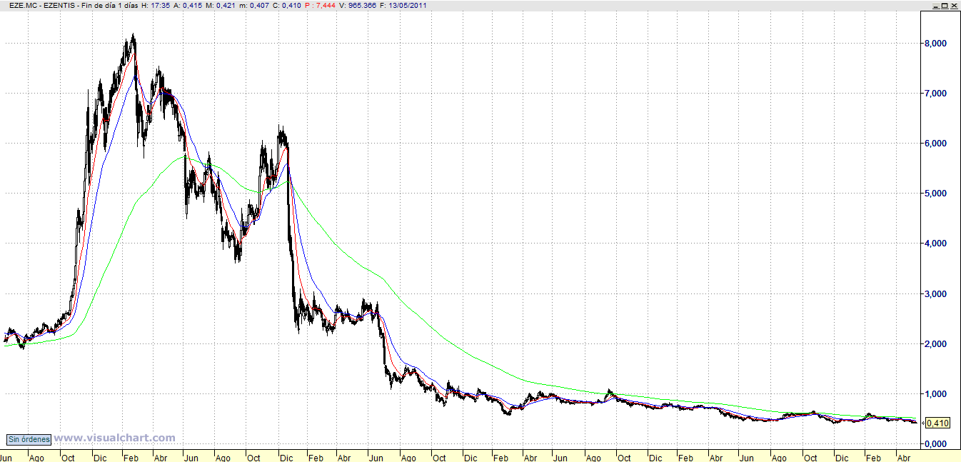 Ezertis ( la antigua Avanzit), muestra un suelo durmiente, que puede despertar en algún momento cercano. Lo vemos caer desde niveles superiores a los 8 Euros y ahora vale veinte veces menos, 0,41.