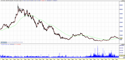 Está en una situación idónea para un cambio de tendencia. El valor subió de 3,25 a 9,2 y ahora a bajado un poco más de tres euros, apoyándose en la media de 200. Normalmente el cambio de tendencia se identifica por la gran subida hasta 9,2, pero la compra buena es esperar a que corrija el 50% más o menos de la subida precedente, es decir la situación actual.
