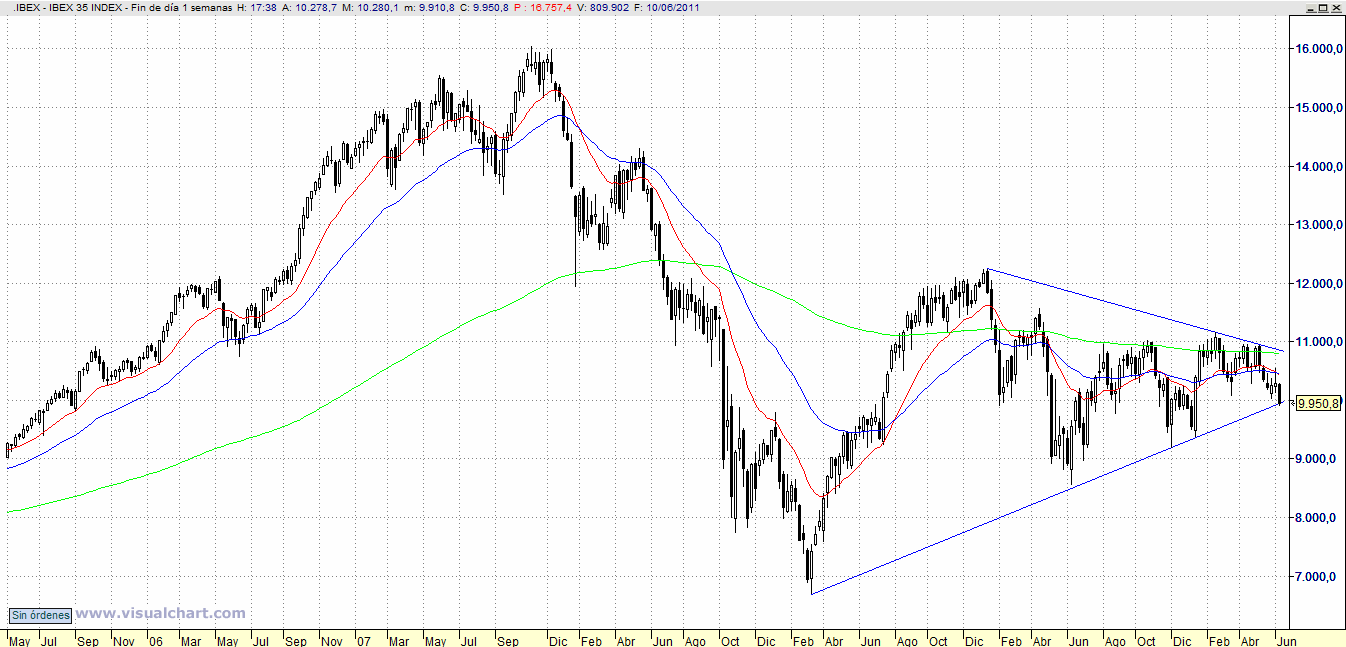 Llevábamos todo el año en un rango lateral 10.000-11.000. La ruptura del mínimo ( aunque solo sea por 50 puntos), nos hace mirar el gráfico de largo plazo. El que mostramos es el gráfico semanal, y lo que vemos es que estamos exactamente en la base de la tendencia alcista.