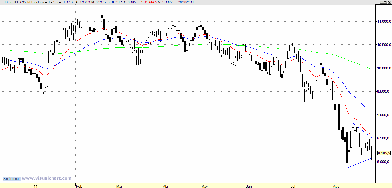 En el gráfico diario del Ibex vemos como, tras una fuerte caída, estamos en un momento más o menos lateral.