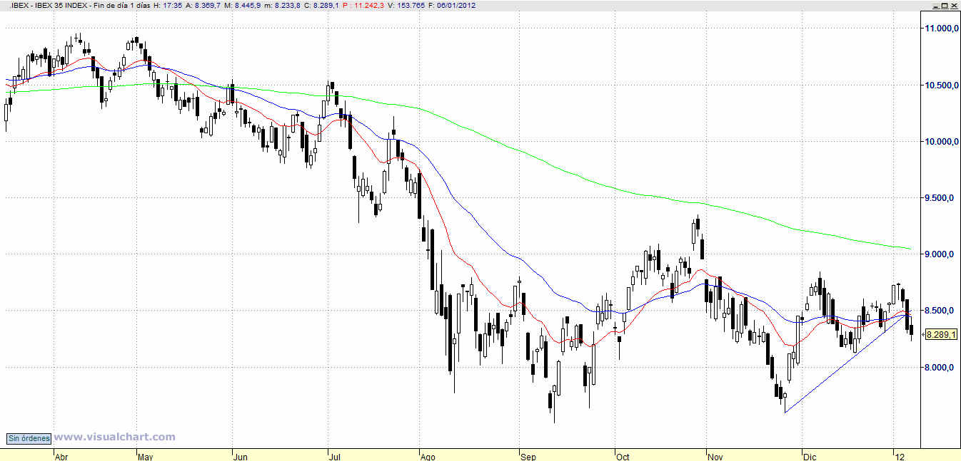 El hecho de que hayamos perdido la directriz alcista de corto plazo, unido a la pérdida también del primer soporte en los 8.300 puntos de Ibex, es preocupante. Pero el hecho de que esto ocurra en un gráfico de largo plazo claramente bajista, es como para preocuparse bastante mas.