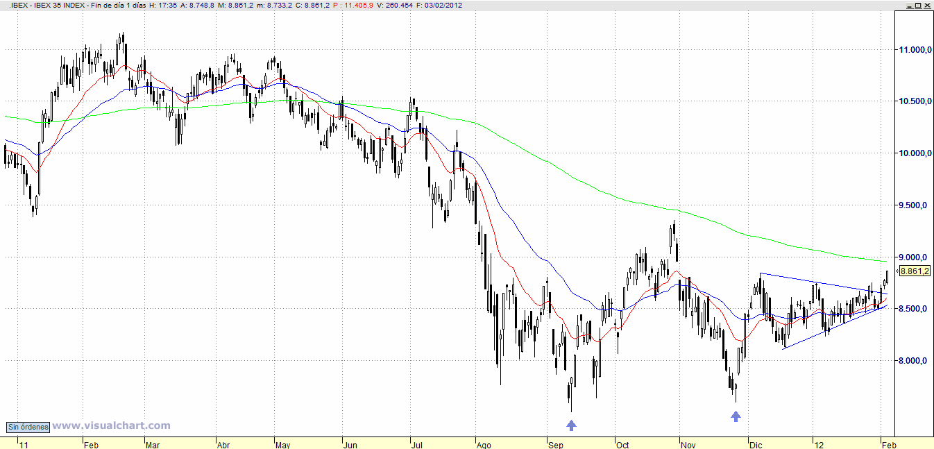 Tras estos mínimos ha venido una buena reacción al alza seguida de un triángulo de consolidación que, por fin, esta semana se ha definido al alza.