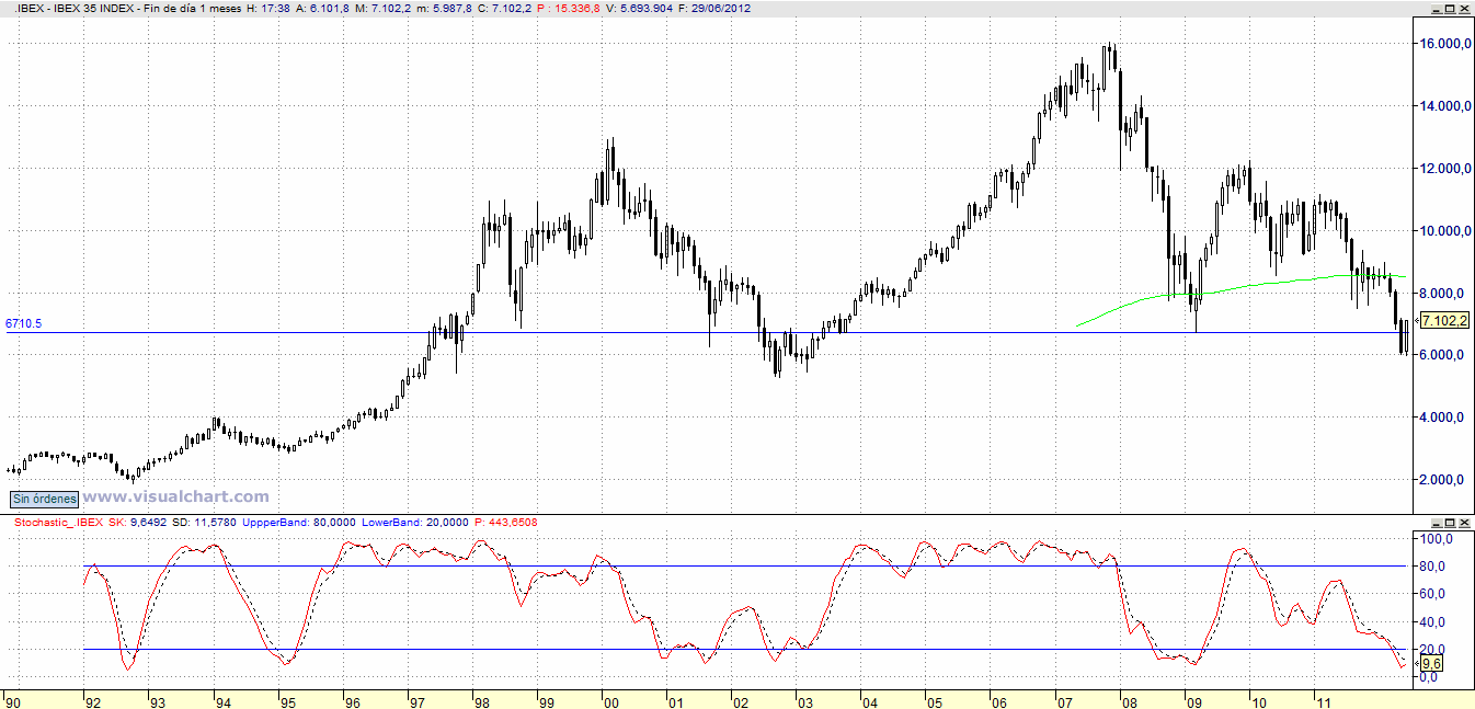 En el gráfico mensual del Ibex también debemos de fijarnos en el indicador Stochastico. está en zona de mínimos, muy sobrevendido y nos avanza un potencial alcista enorme.