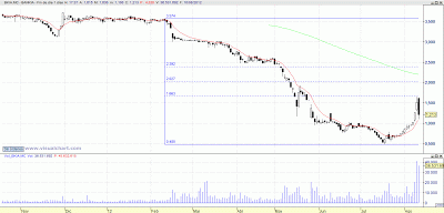 Ha subido un increible 150% desde los mínimos, lo que pasa es que ha sido tal la caída, que observando el gráfico lo único que ha hecho ha sido llegar al objetivo mínimo de rebote según los retrocesos de Fibonacci, por lo que sigue siendo un valor claramente bajista. Ni tocarlo.