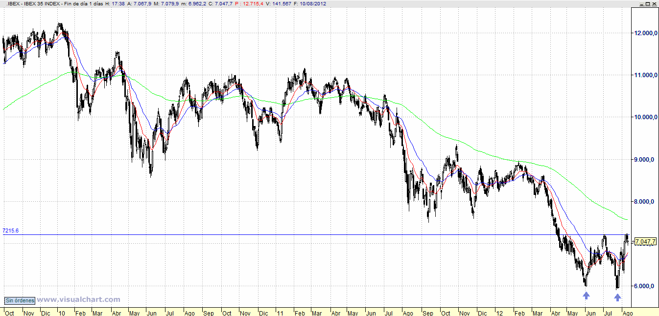 Lo interesante es que la media de 200 periodos ronda los 7.500 puntos, por lo que si el se cumple el objetivo del doble suelo, estaríamos instaurados al fin en una clara tendencia alcista.amos en tendencia alcista