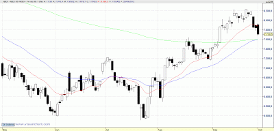 También podemos ver cuales de estos valores han sido capaces de mantenerse por encima de su media de 200 periodos en esta corrección. En pura teoría en estos es en los que hay que apostar. Yo he hecho una lista del grupo de valores que cumplen está condición, aunque he obviado los que manejan muy poco volumen. La lista está compuesta por: