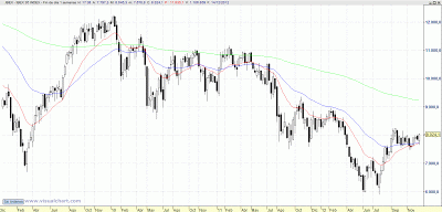 Vemos una subida casi en vertical desde el 6.000 al 8.200 y luego una consolidación de 12 semanas, nada menos, con mínimos en los 7.500. Técnicamente la consolidación se produce a mitad camino del movimiento completo, por lo que deberíamos tener una subida hasta los 9.200 más o menos.