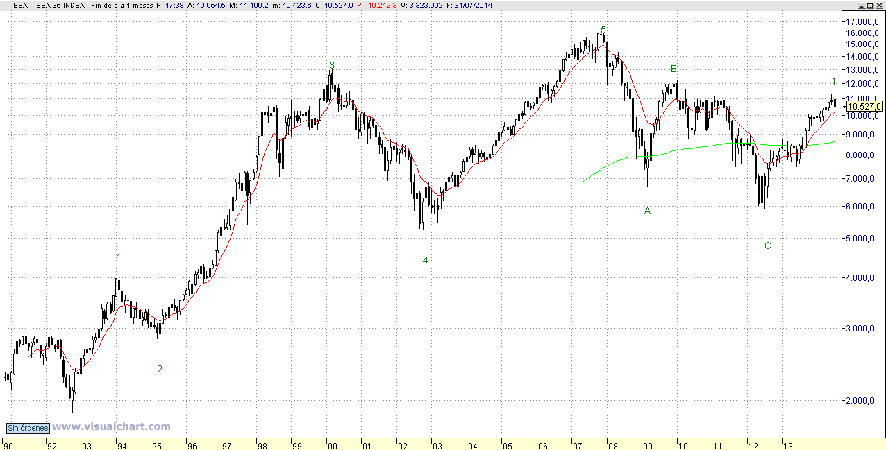 De momento estamos en la onda 1 de nuevo, que allá por el año 1992, nos llevó a ganar un 100% en el índice. Ahora hemos subido del 5.900 al 11.250, ha faltado poco para el 100%. Ahora estamos dando señales de agotamiento en el corto plazo.