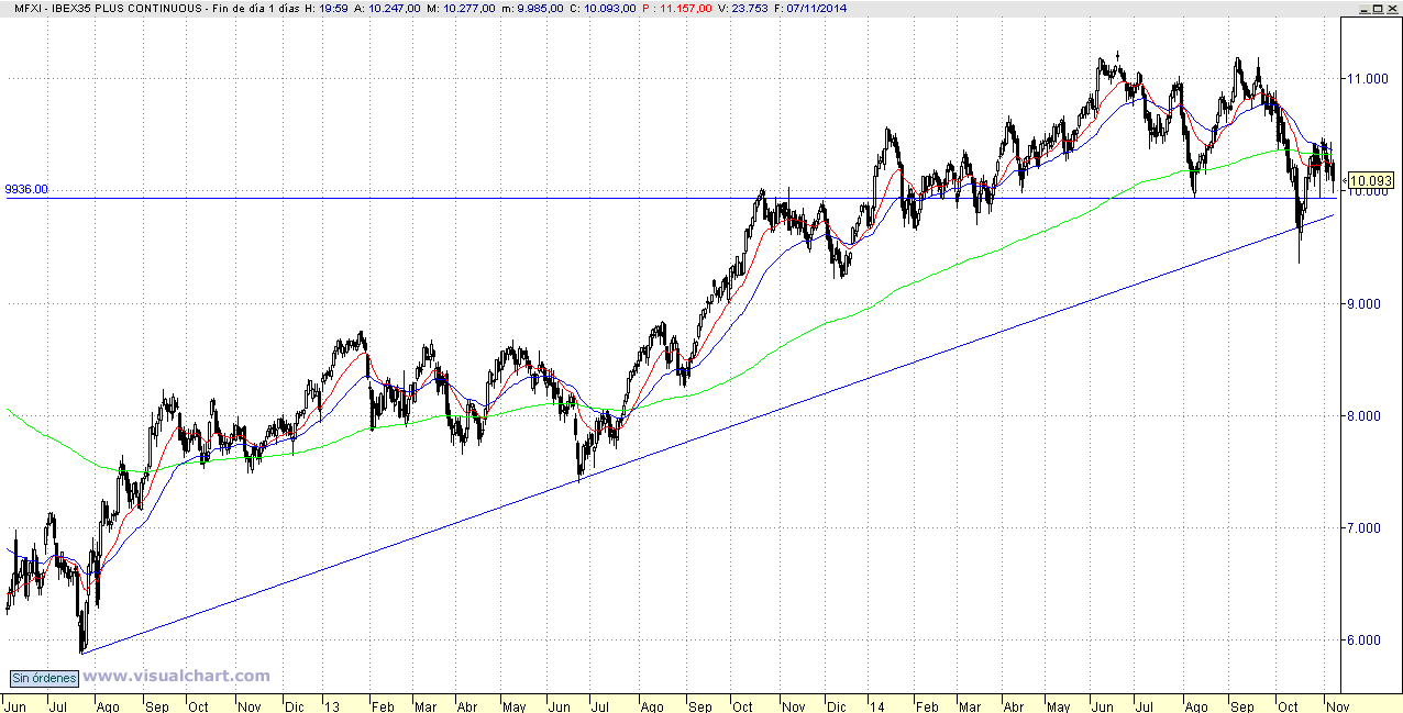 Como vemos en el gráfico, la tendencia básica sigue siendo alcista y pasa por la zona de los 9.800 puntos.