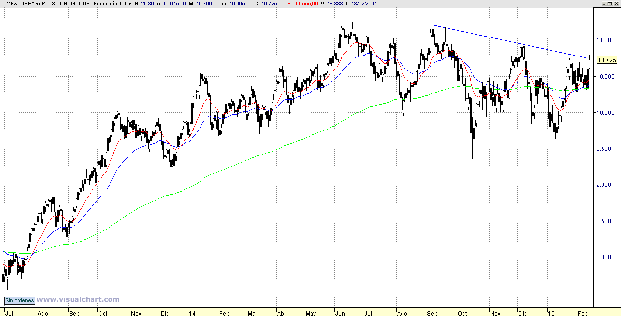 El Ibex se enfrenta a su resistencia en los 10.750, por donde pasa también la linea de resistencia que vemos en el gráfico. El viernes llegó a superar el nivel, pero no pudo hacerlo al cierre.