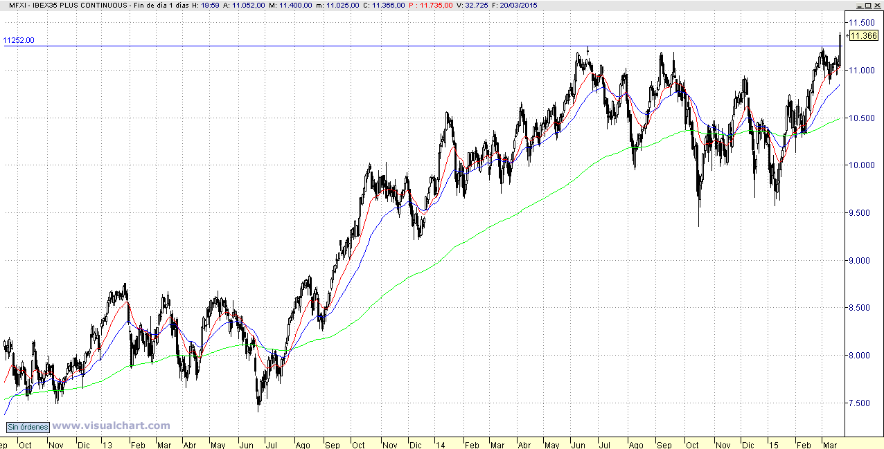 Hemos superado holgadamente los 11.250, cerrando en los 11.419, por lo que podemos ya afirmar, que hemos superado los sustos de Octubre, Diciembre y Enero, que nos situó por debajo de la media de 200, y definitivamente somos alcistas en el largo plazo.