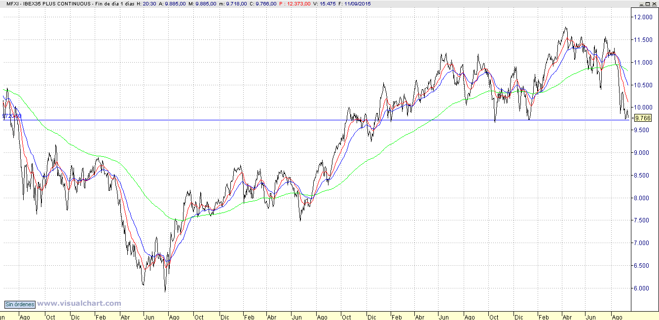 El aspecto del Ibex es peligroso. Vemos que hemos llegado al soporte en precios de cierre de los 9.720 puntos, pero que si al resto del mundo le da por tener un segundo tirón bajista, cómo es lo más probable, saltará por los aires muy facilmente, y si esto ocurre, podemos sacar los paraguas, porque puede haber otra caída muy violenta.