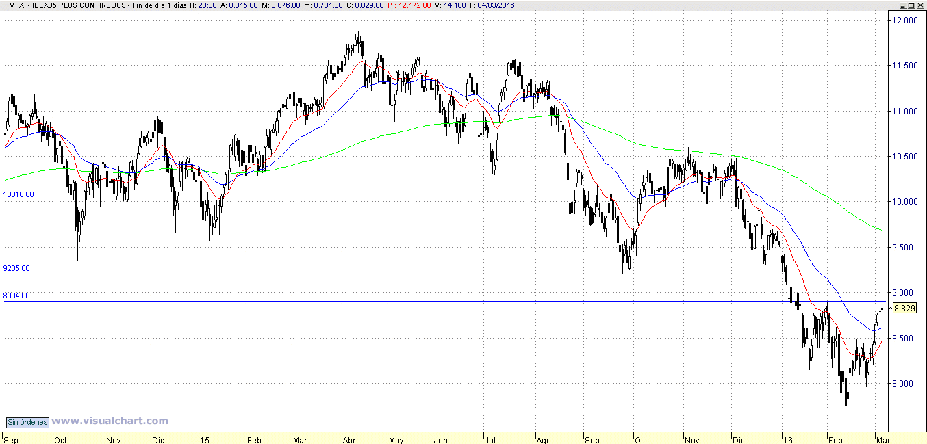 Teniendo en cuenta que los Americanos ya han tocado su media de 200 días y llevan tres semanas subiendo, toda precaución es poca. Yendo todo bien, deberíamos bajar a la zona de los 8.500 puntos para coger fuerza y atacar los 8.900, pero ante cualquier noticia relativamente mala, podemos volver a las caídas de vértigo.