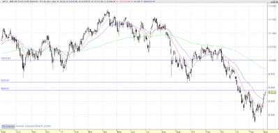 El primer nivel importante del Ibex son los 8.900 puntos, la superación de este nivel supondría la ruptura de la sucesión de mínimos y máximos decrecientes, por lo que sería una primera señal de cambio de tendencia. El segundo nivel, los 9.200 son una resistencia a tener muy en cuenta, pero el nivel de los 9.700, donde coinciden la media de 200 días y la tendencia bajista es la verdadera clave del cambio de tendencia.