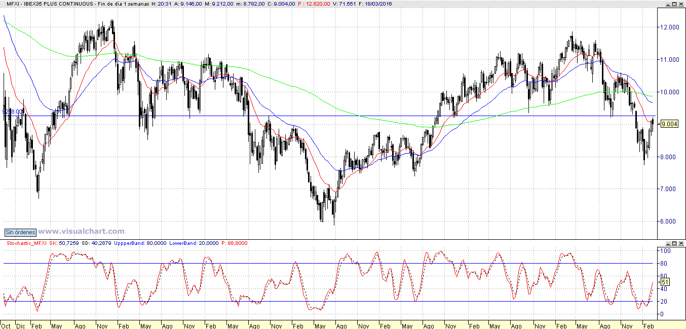 En el gráfico semanal del Ibex, vemos que el Ibex no ha podido con los 9.200 puntos. Esto puede parecer normal, y que pensemos que está cogiendo fuerza para su superación definitiva. Es una teoría creíble, lo que ocurre es que esta semana lo ha tenido todo a favor para superarlos y no lo ha hecho.
