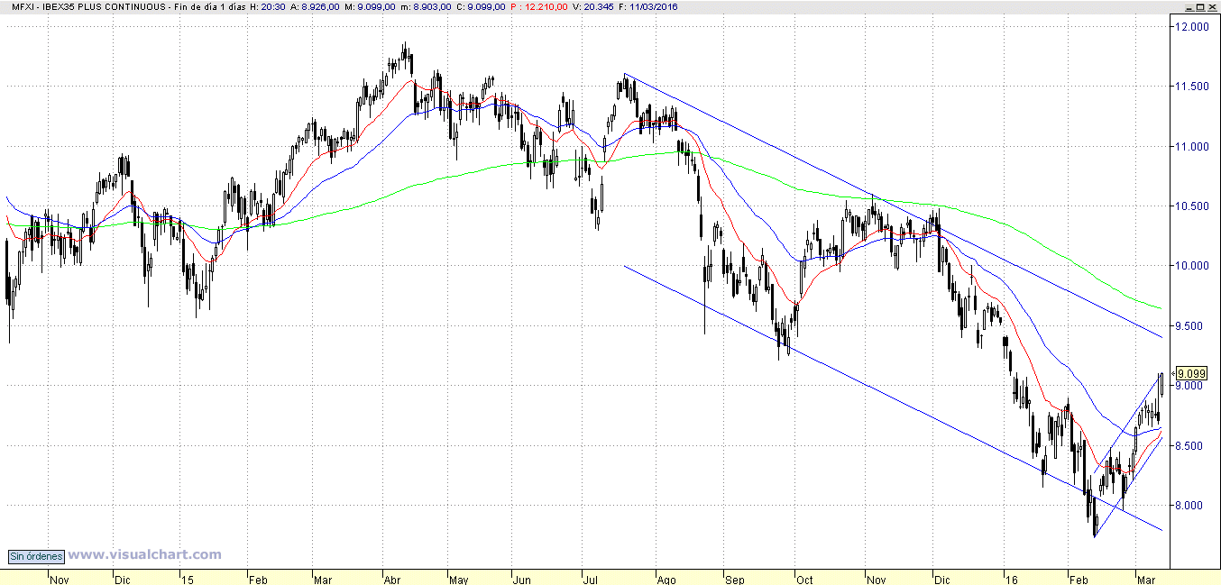 El Ibex, que bajó sin respiro desde los 10.500 hasta los 7.750, está en plena fase alcista de corto plazo.
