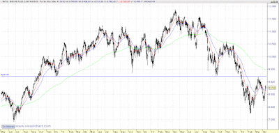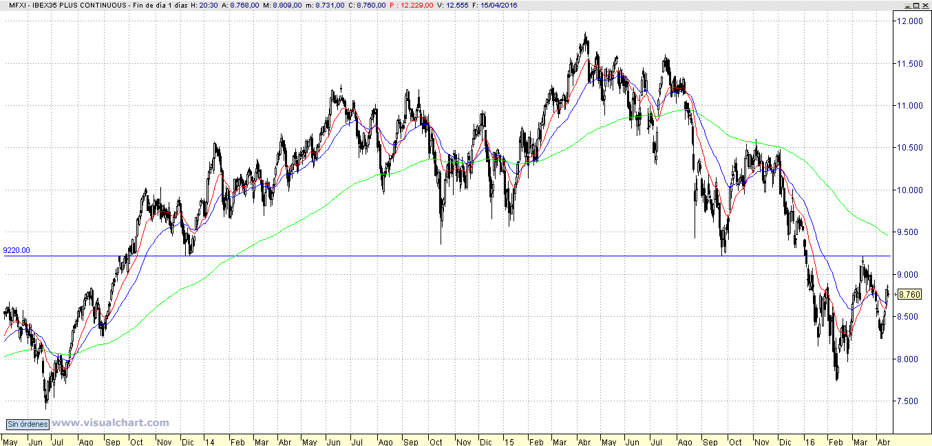 Ya dijimos la semana pasada que podríamos subir un poco más, pero que el mercado es bajista, pues ahí está. Seguimos por debajo de la media de 200, y esta con pendiente negativa, que nos da una clara visión bajista de largo plazo. La media de 200 está sobre los 9450 y hay una importantísima resistencia en la zona de los 9.200. Por todo esto, el aspecto sigue siendo de peligro.