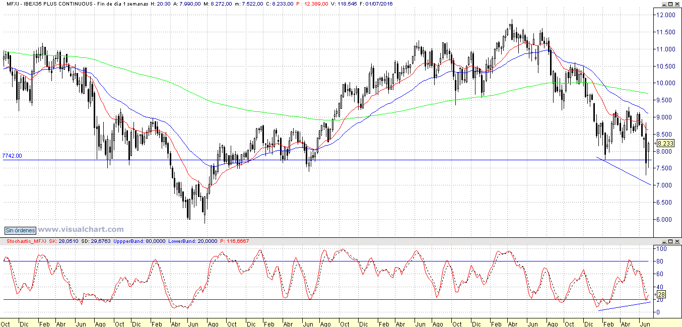 Por un lado las divergencias alcistas son clarísimas en gráficos diarios y semanales ( ejemplo en el gráfico adjunto), lo cual refuerza la idea del suelo, al igual que el pesimismo vivido, que ha sido máximo, con el Brexit, y sobre todo los augurios de que nadie sabe que va a pasar, que puede haber hecho que le entrara el miedo a mucha gente, miedo que consigue hacer vender en el peor momento.
