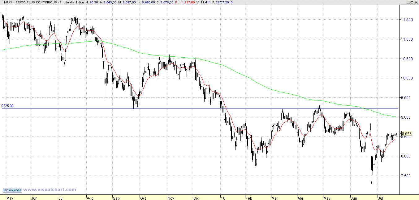Nosotros, nuestro Ibex, lleva 9 sesiones enmarcado entre los 8.600 y los 8.400, por lo que la superación de estos 8.600 debería llevarnos a enfrentarnos a la importantísima zona de 9.000-9.200.