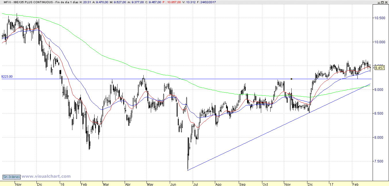 El Ibex es claramente alcista, por encima de su resistencia de los 9.200 puntos, en tendencia alcista, y por encima de una media de 200 días creciente. No se puede pedir más.