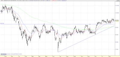 Los bancos siguen con su partícular consolidación, y serán ellos los que den el pistoletazo de salida al Ibex. Dentro de estos, el Popular sigue goteando a la baja y ya veremos hasta donde. Bankia ha flojeado un poco con la noticia del contra-split de 4 por 1, que hará que las acciones valgan casi 4€ cada una.