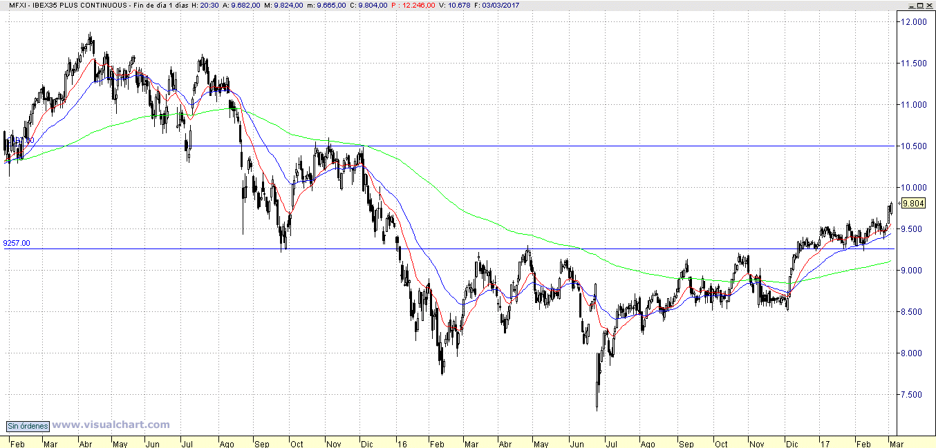 Dentro de los Bancos, destaca BBVA, haciendo máximos desde Diciembre del 2015, Sabadell, que ha saltado cómo un resorte y Bankia, que sigue teniendo un gran aspecto y promete enfrentarse a su resistencia de 1,044 y si la supera, seguir hasta la zona de 1,2.