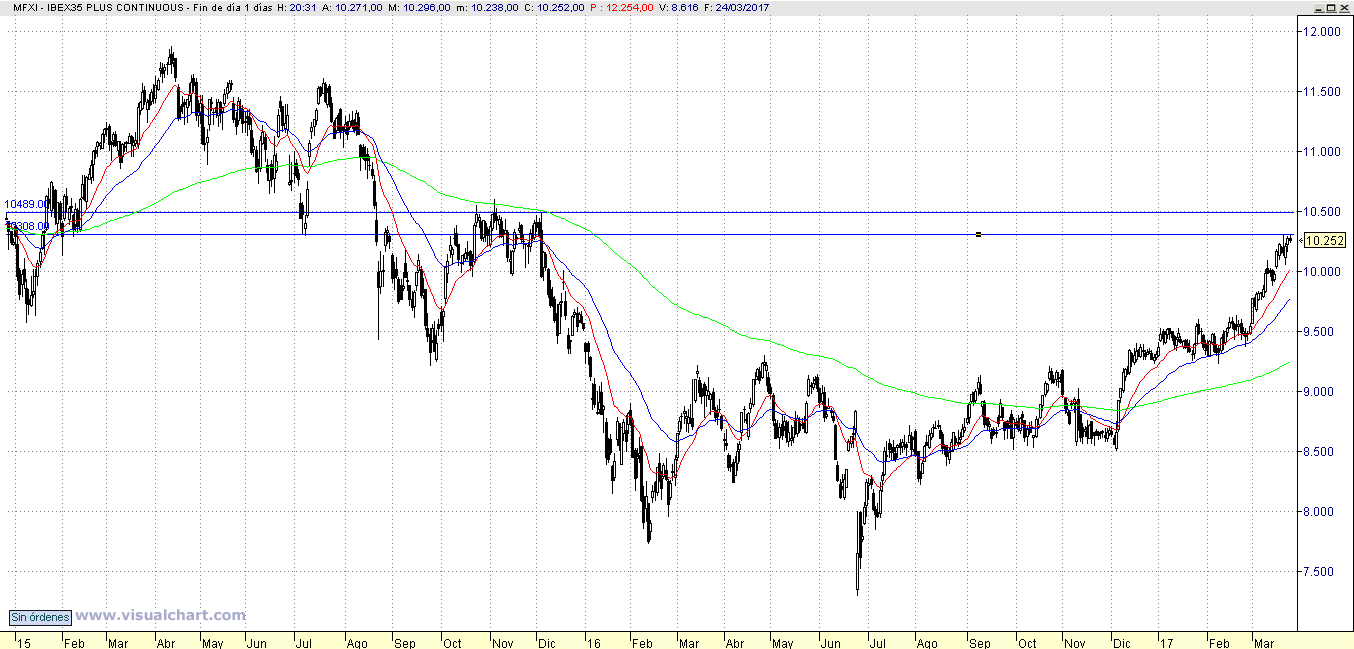 El martes, coincidiendo con la llegada a la primera resistencia en los 10.300 puntos, marcamos una clara vela de vuelta bastante fea, que nos indicaba el probable comienzo de la corrección. Sin embargo, el mismo miércoles ya acabamos con mucha fortaleza y se anuló la señal, con lo que hemos vuelto a los 10.300, con la impresión de que vamos a tener un movimiento lateral, para continuar subiendo.